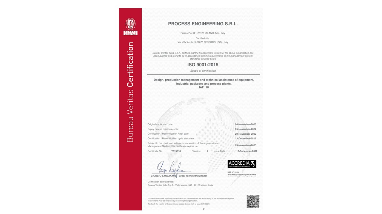 Design, construction, supply, supervision and maintenance of Process Equipment, Machinery, lndustrial Packages, lndustrial Skid, lndustrial Equipment and Turn-Key Process Plants. Certificate N° IT251830